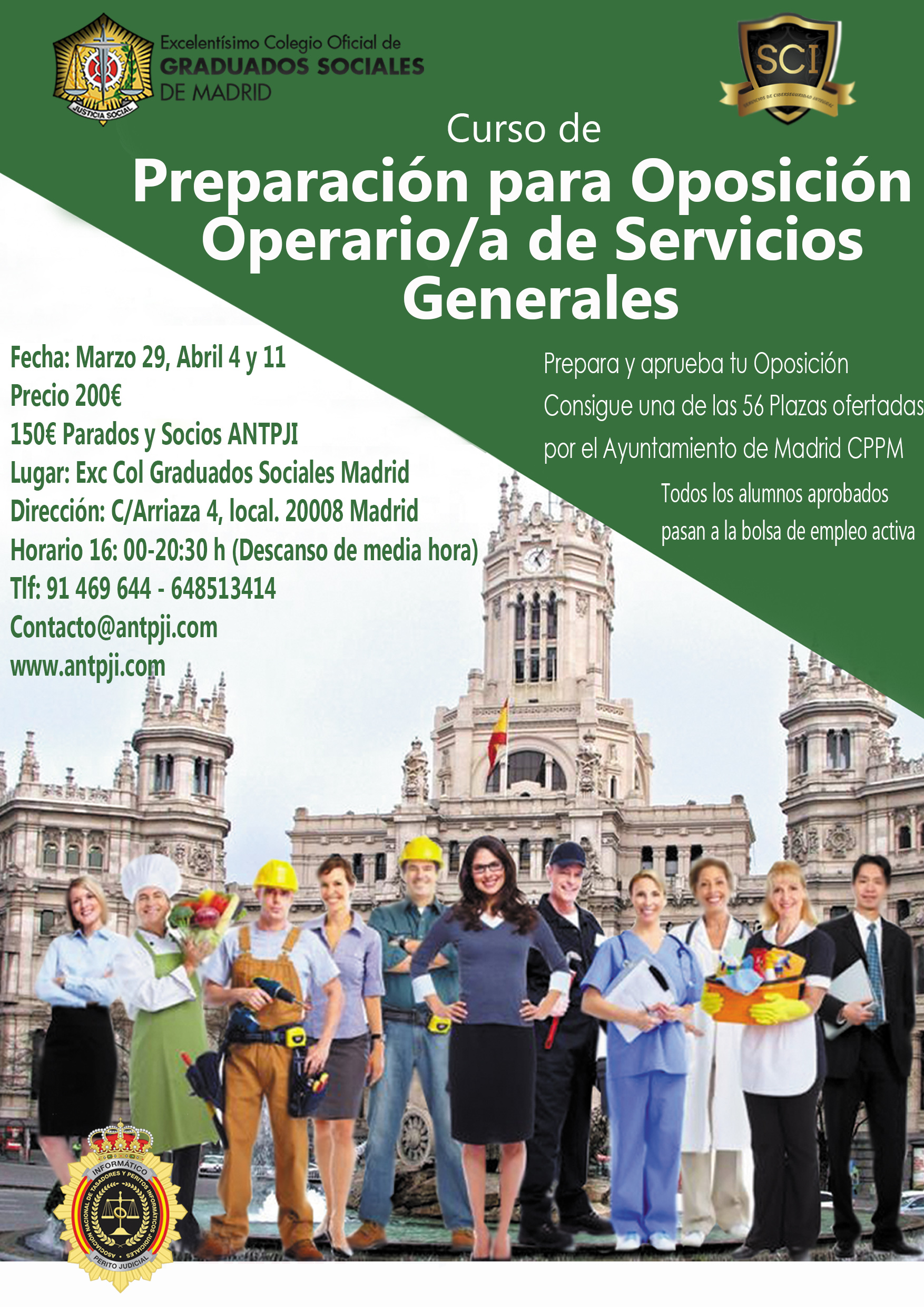 El Ayuntamiento de Madrid oferta 56 plazas para Operario/a Servicios Generales. La ANTPJI ha brindado su colaboración con el Excelentísimo Colegio
